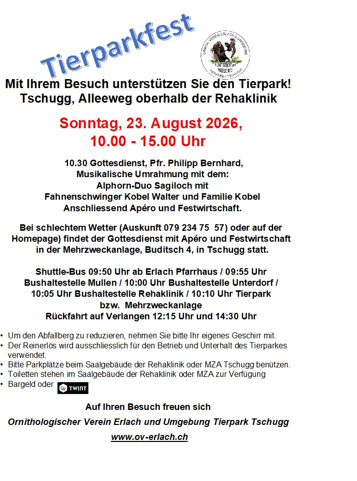 Ornithologischer Verein Erlach und Umgebung Tierpark Tschugg 3235 Erlach Iban: CH77 0900 0000 8725 0648 5 |